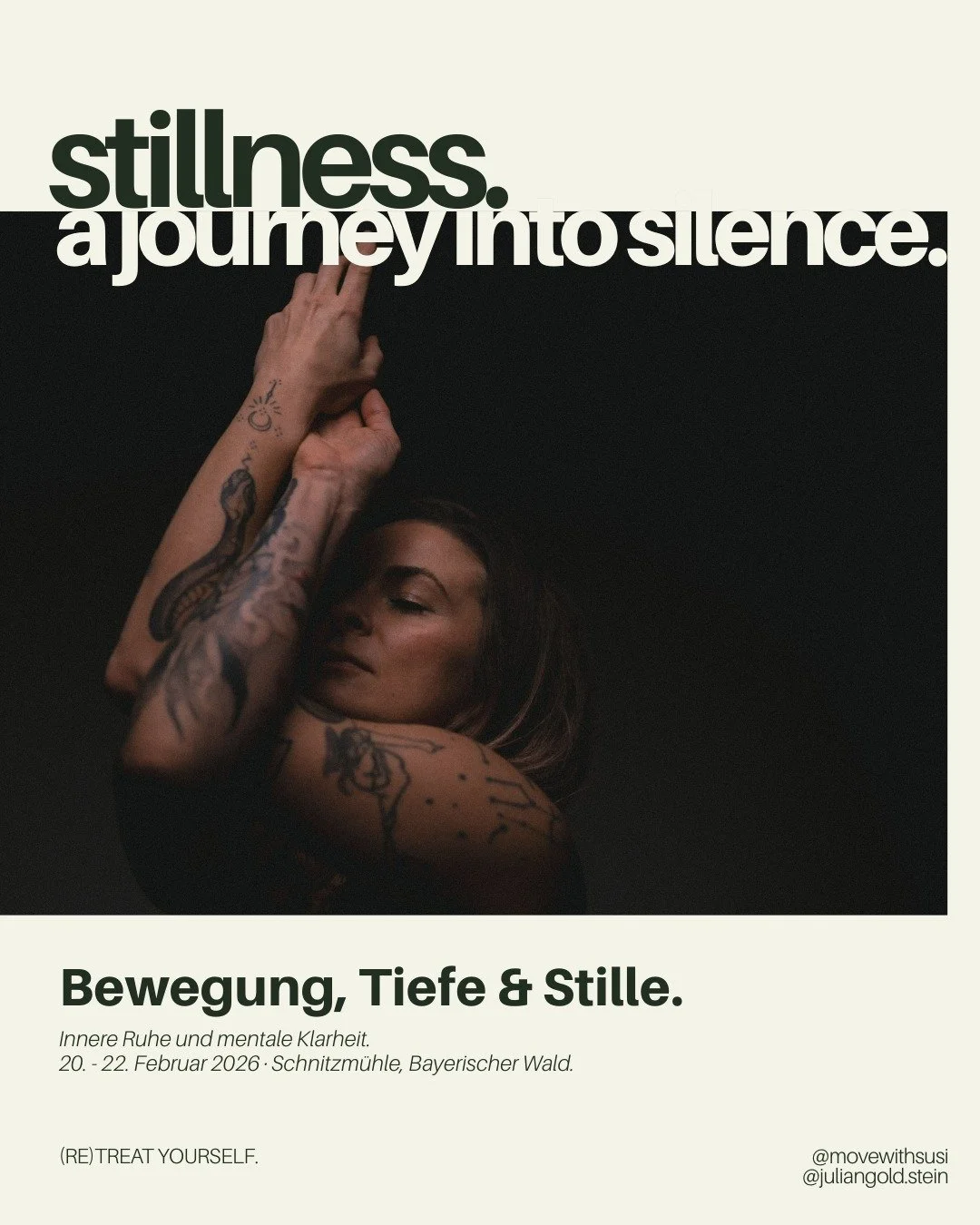 Retreatyourself.space ist mein persönlicher Ort für das, was mich selbst über Jahre gehalten, verändert und zurück auf den Boden gebracht hat: Bewegung, Stille, ehrliche Körperarbeit, Nervensystem, Verbindung.